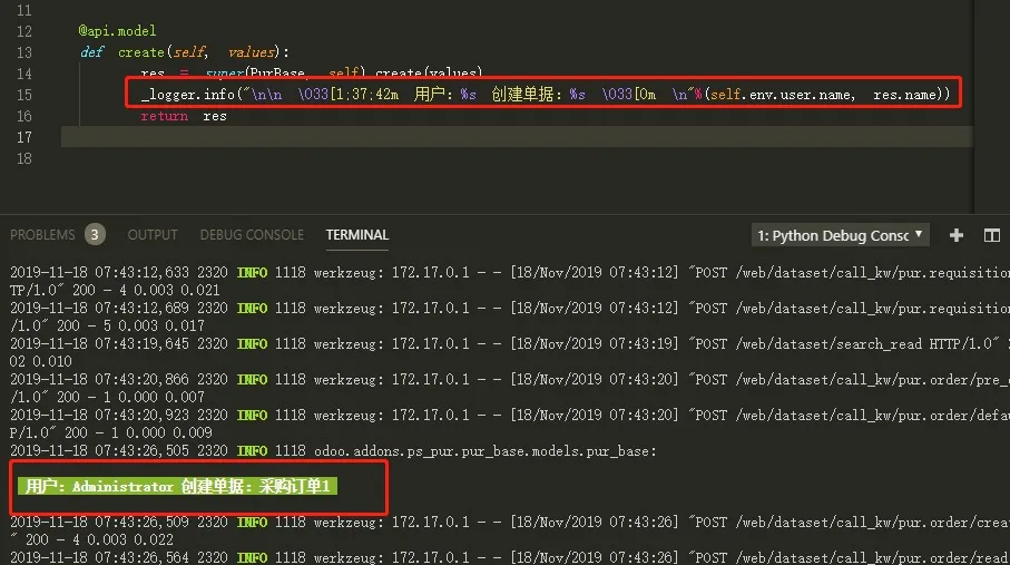 1 | _logger.info("\n\n \033[1;37;42m 用户:%s 创建单据:%s \033[0m \n"%(self.env.user.name, res.name)) |